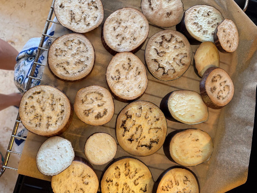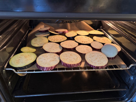 - Bakłażany pieczemy na grillu w piekarniku z odrobiną pokrojonego czosnku – opiekamy z dwóch stron