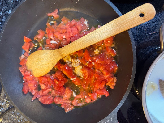 - Z pokrojonych pomidorów robimy salsę na pateni dodając suszone słodkie pomidory oliwę dużo czosnku, sól, pieprz i koniecznie szczyptę cynamonu