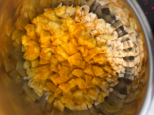 - Podsmażamy warzywa drobno pokrojone na masełku w garnku dodając domową kostkę rosołową lub suszoną włoszczyznę oraz odrobinę curry, sól, pieprz