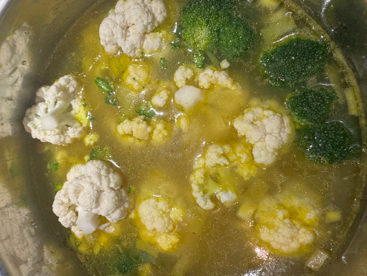 - Dodajemy kwiaty kalafiora brokula i bruskelkę i gotujemy kolejne 5 min aby nowo dodane warzywa były aldente